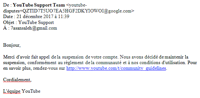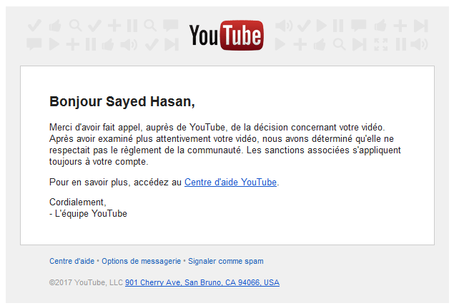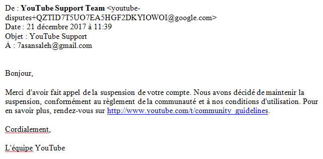 It is necessary to specify, to the credit of Youtube, that an appeal procedure also exists against the suppression of a channel, and this time, not 200 but 1000 characters are allowed, about 120 words. It may seem light for a job of several years (maybe the work of a lifetime), completely destroyed in a few clicks by Google, but legalistic to the end, I followed this pseudo-procedure the same day. The response was quick – to the credit of Youtube, let us quote again this particularly expeditious and recurrent judicial time: 12 hours, against several years for the traditional justice system. It seems obvious that the appeal procedures are systematically rejected by a mail-type sent automatically after 12 hours. This answer is worth quoting in its entirety, its brevity lending itself willingly:
